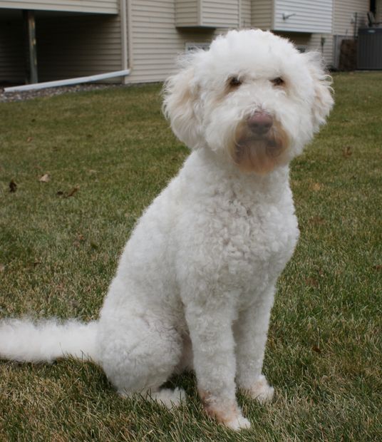 Marigold has a wavy fleece silken red and white parti coat sprinkled with large soft curls.