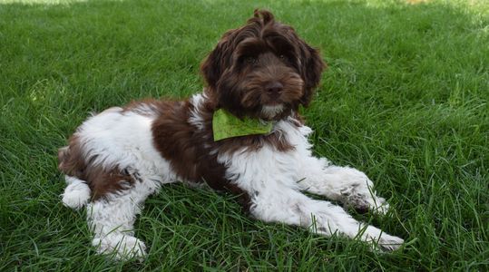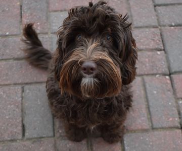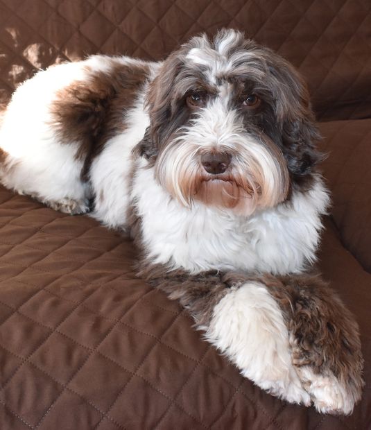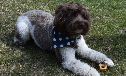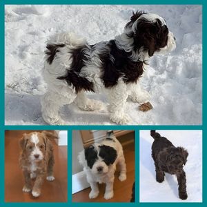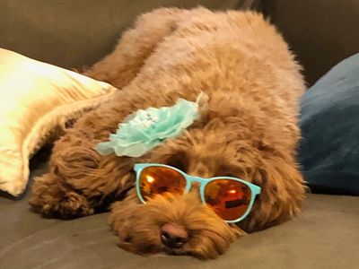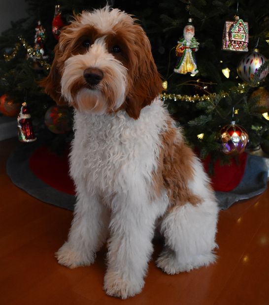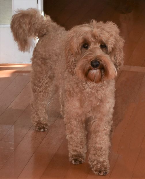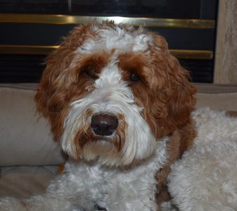 Jolie Cheveux Roux (pretty red hair in French) certainly describes our lovely Roux. Don't let the good looks fool you... she does training with a K-9 handler and is as smart as they come! Roux has her mom's zest for life, love of the outdoors and she is a good little sister to Katy the labradoodle in her guardian home.